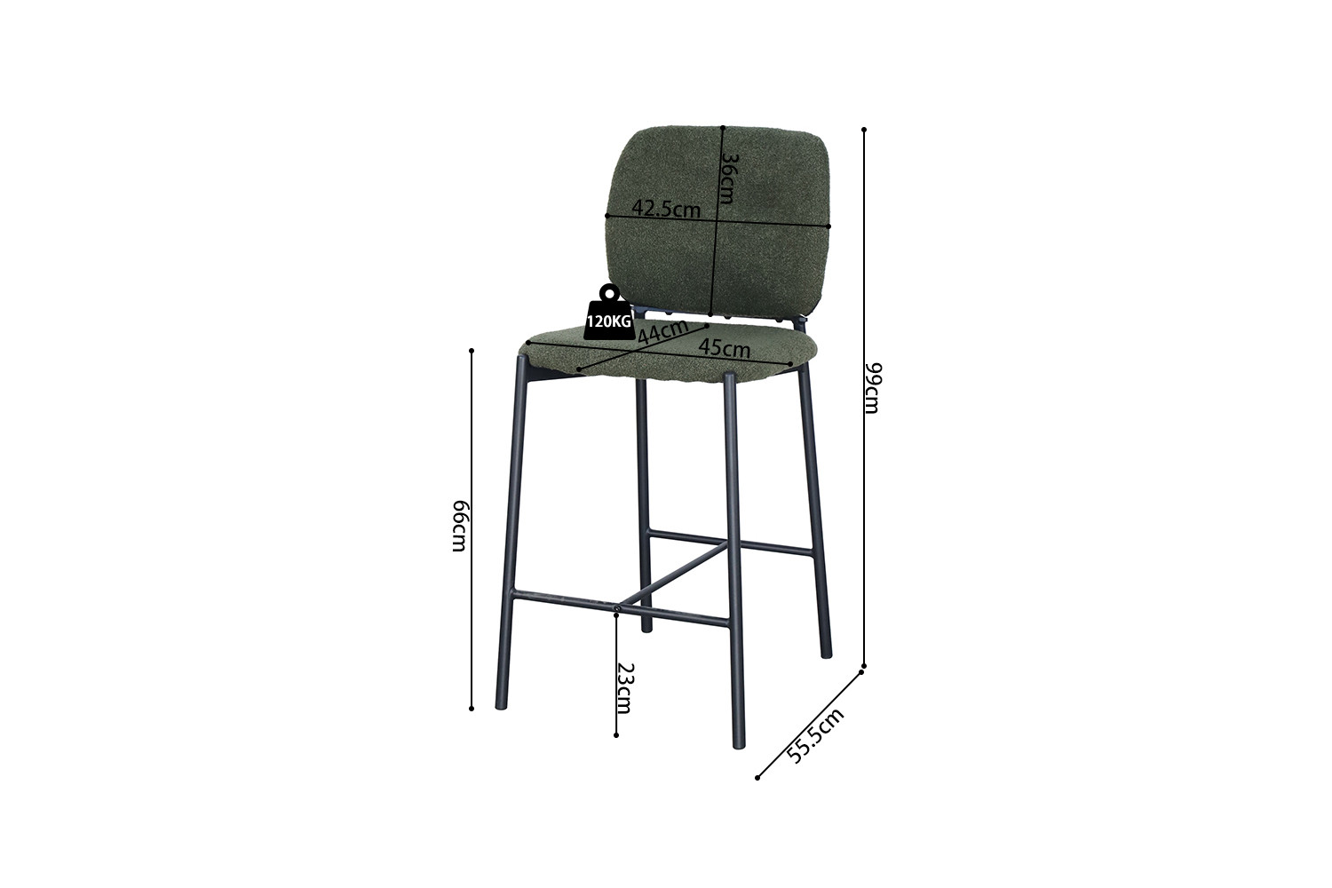 Barstoel Sophia groene stof, afmetingen 99×45×55,5 cm, stijlvol en comfortabel.
