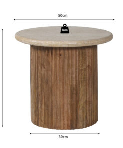 Deze bijzettafel van mangohout met beige travertijn geeft je interieur een warme en stijlvolle uitstraling. Met een hoogte van 45 cm en een formaat van 50 × 50 cm biedt de tafel een praktisch oppervlak voor decoratie, boeken of een kop koffie.