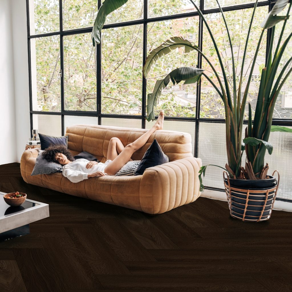 De Bodiax Plak PVC Aringa 147 Noir Prestige combineert de diepe, natuurlijke uitstraling van hout met het gemak van een verlijmde PVC-vloer. De Noir Prestige-tint is een zeer donkerbruine tot bijna zwarte houtkleur met subtiele nerven en natuurlijke kleurnuances, die een luxe, elegante en moderne sfeer in iedere ruimte creëert.