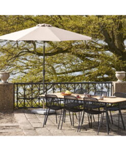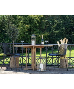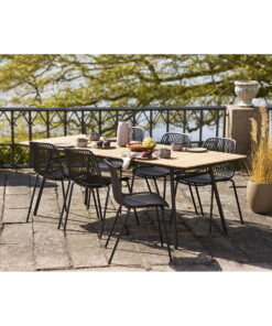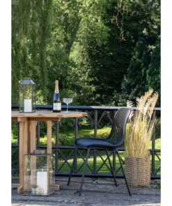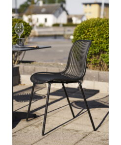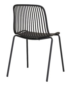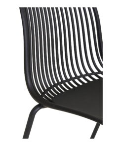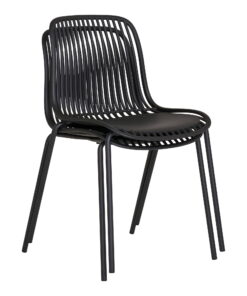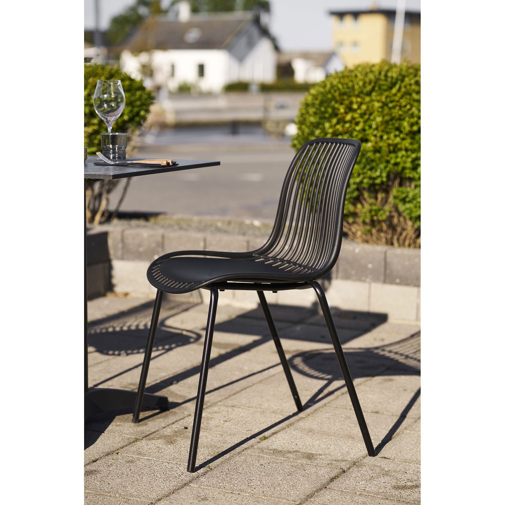 Zwarte, stapelbare eetkamerstoel met polypropyleen zitting en stalen frame. Zithoogte 46,5 cm; totale hoogte 82 cm; lengte 55 cm; breedte 46,5 cm; diepte 43 cm.
