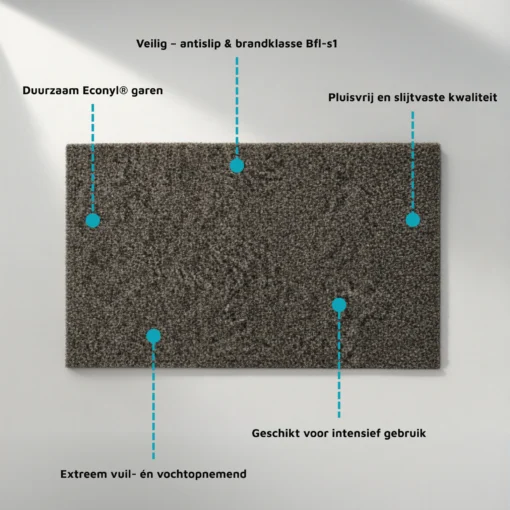 Naast het opvangen van vuil en vocht biedt deze mat comfort en stabiliteit. De vezels dempen geluid en voorkomen uitglijden, waardoor bezoekers veilig en comfortabel door de entree kunnen lopen.