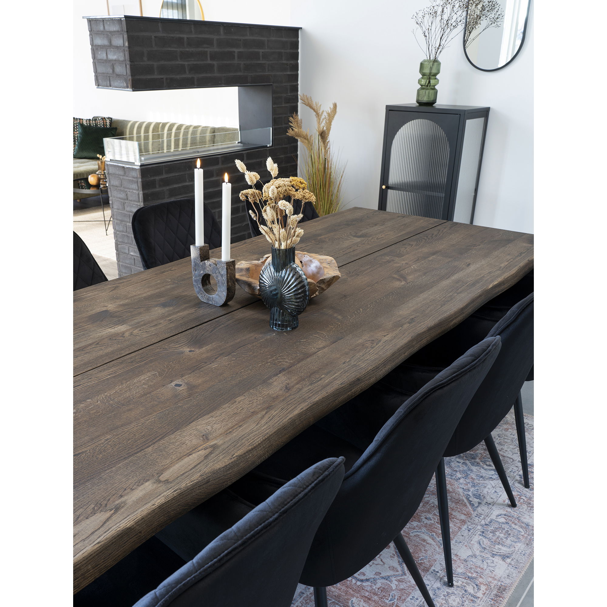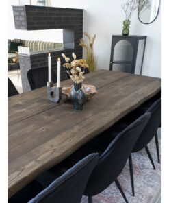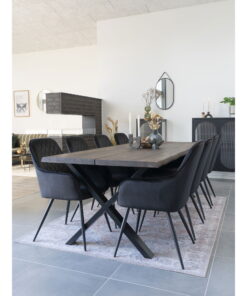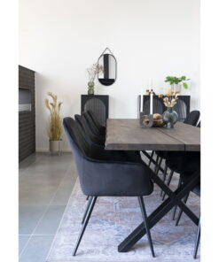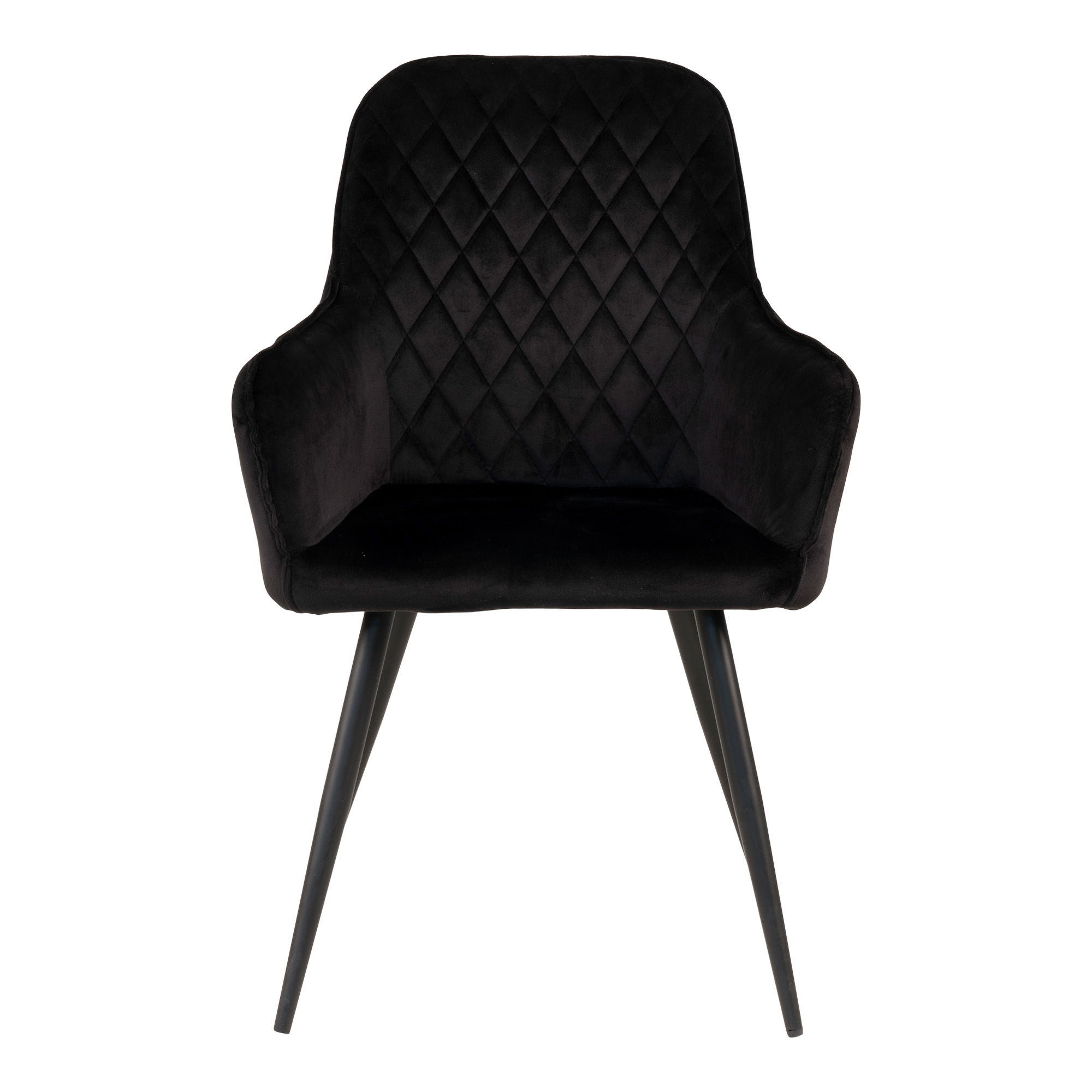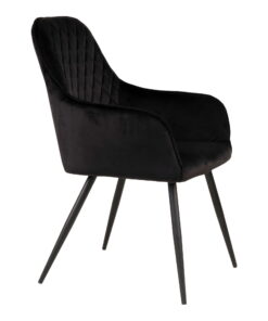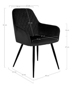 Eetkamerstoel HN1207 — zwart fluweel met zwarte stalen poten. Zithoogte 47 cm. Afmetingen: H 87 × L 65 × B 57 × D 47 cm. Materiaal: fluweel, staal.