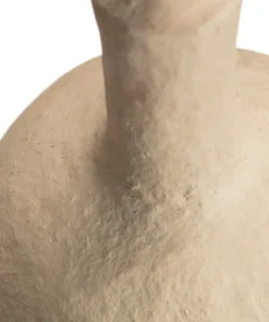 De lamp is gemaakt van stevig, handgevormd papier-maché met een natuurlijke kleur. Dit milieuvriendelijke materiaal zorgt voor een matte, rustieke uitstraling en een warme lichtverspreiding. Elk exemplaar is uniek door de handmatige afwerking.