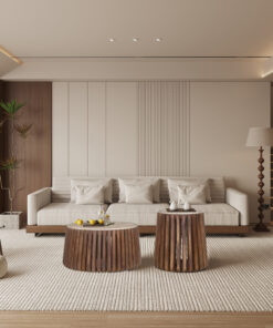 De mix van hout en steenlook sluit moeiteloos aan bij moderne, Japandi en warm-minimalistische interieurs. Combineer met lichte stoffen en aardetinten voor een serene sfeer, of met zwarte details voor extra contrast. Zoek je een ronde salontafel van 70 cm in mangohout met beige travertin uitstraling die je interieur meteen meer karakter geeft? Dan is dit een tijdloze keuze voor een stijlvolle woonkamer.