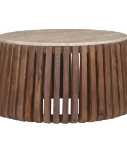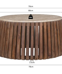 Deze ronde salontafel combineert de warme uitstraling van mangohout met de luxe look van beige travertin en geeft je woonkamer direct een stijlvol, natuurlijk accent. Met een formaat van 70 × 70 cm en een hoogte van 40 cm past hij perfect voor de bank en biedt hij voldoende ruimte voor koffiemomenten, woonaccessoires en dagelijks gebruik. De ronde vorm zorgt voor zachte lijnen en maakt de zithoek optisch rustiger.