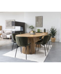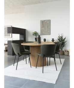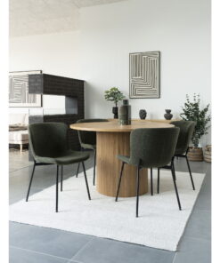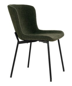 Stijlvolle eetkamerstoel in donkergroen bouclé met zwarte poten (HN1241). Afmetingen: 59×48×83 cm (L×B×H), zithoogte 47 cm, diepte 40 cm. Materialen: schuim, polyester, staal.