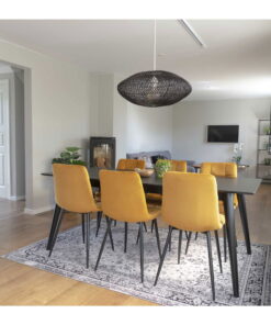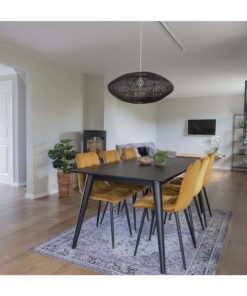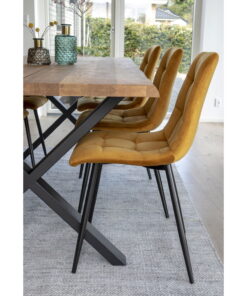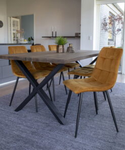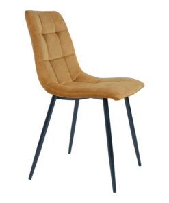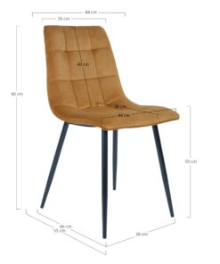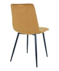 Eetkamerstoel HN1004 — mosterdgeel polyesterfluweel met zwarte stalen poten. Stijlvol en comfortabel. Afmetingen: H 86 cm, Lengte 55 cm, B 44 cm, D 38 cm. Zithoogte 50 cm. Materialen: polyester velvet, staal.