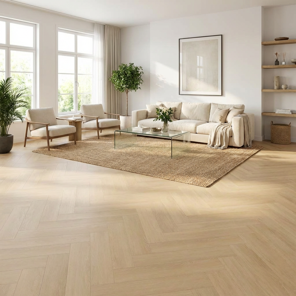 Breng warmte en karakter in je interieur met de Lumina click visgraat PVC vloer in lichtbruin van OnlineWonen. Het klassieke visgraatpatroon geeft elke ruimte een luxe en verfijnde uitstraling, terwijl de subtiele houtlook een natuurlijke en tijdloze basis biedt. Perfect voor woonkamer, hal, slaapkamer of kantoor, passend bij zowel moderne als landelijke woonstijlen.