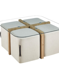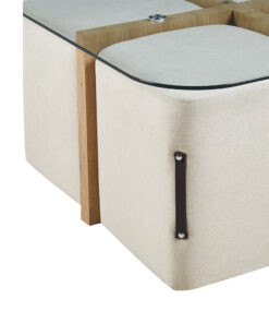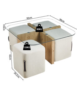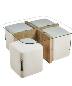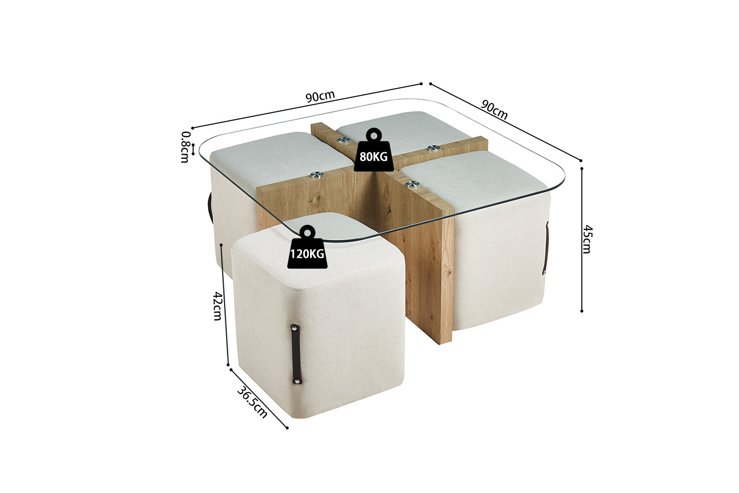 Door het neutrale kleurenpalet combineer je dit setje eenvoudig met zachte stoffen, houttinten en zwarte accenten. Zoek je een salontafel van 90 × 90 cm met poefs die je zithoek praktisch én opgeruimd houdt, zonder in te leveren op sfeer? Dan is dit een ideale keuze voor dagelijks gebruik.