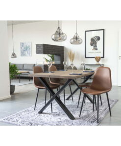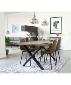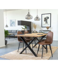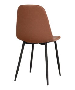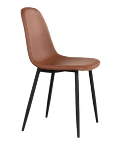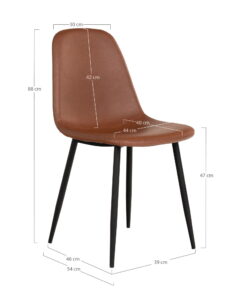 Eetkamerstoel HN1224 — vintage lichtbruin PU-leer met zwarte stalen poten. Zittinghoogte 47 cm. Materialen: PU, multiplex, staal. Afmetingen: H 88 × L 54 × B 44 × D 40 cm.