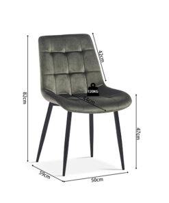 Deze eetkamerstoel met groen fluwelen bekleding geeft je interieur een luxe en stijlvolle uitstraling. Met een hoogte van 82 cm en een formaat van 50 × 59 cm biedt de stoel een comfortabele zit aan de eettafel of in een gezellige zithoek. De zachte fluwelen stof zorgt voor prettig zitcomfort en maakt de stoel geschikt voor lange diners of ontspannen momenten.
