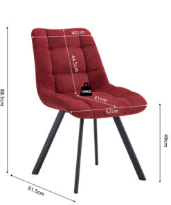Deze eetkamerstoel met rode stoffen bekleding geeft je interieur een warme en opvallende uitstraling. Met een hoogte van 88,5 cm en een formaat van 52 × 61,5 cm biedt de stoel een comfortabele zit aan de eettafel of in een gezellige zithoek. De zachte stof zorgt voor prettig zitcomfort en maakt de stoel geschikt voor lange diners of ontspannen momenten.