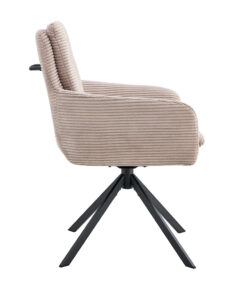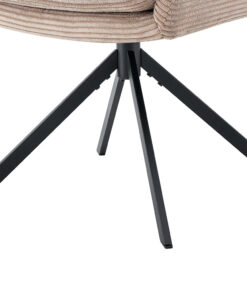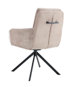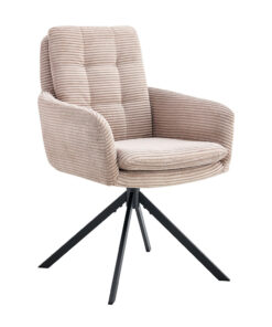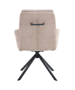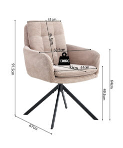 Deze draaibare eetkamerstoel met zandkleurige corduroy bekleding geeft je interieur een warme en moderne uitstraling. Met een hoogte van 91,5 cm en een formaat van 60,5 × 67 cm biedt de stoel een comfortabele zit aan de eettafel of in een gezellige zithoek. De zachte corduroy stof zorgt voor prettig zitcomfort, ideaal voor lange diners of ontspannen momenten.