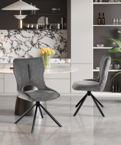 Deze draaibare eetkamerstoel met donkergrijze stoffen bekleding geeft je interieur een moderne en stijlvolle uitstraling. Met een hoogte van 90 cm en een formaat van 48 × 59,5 cm biedt de stoel een comfortabele zit aan de eettafel of in een gezellige zithoek. De zachte stof zorgt voor prettig zitcomfort en maakt de stoel geschikt voor lange diners of ontspannen momenten.
