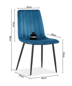 Deze eetkamerstoel met blauwe fluwelen bekleding geeft je interieur een elegante en moderne uitstraling. Met een hoogte van 86 cm en een formaat van 45 × 55 cm biedt de stoel een comfortabele zit aan de eettafel of in een gezellige zithoek. De zachte fluwelen stof voelt aangenaam aan en zorgt voor extra zitcomfort tijdens lange diners of ontspannen momenten.